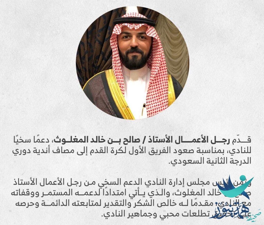 قدم رجل الاعمال الاستاذ صالح بن خالد المغلوث دعماً سخياً لنادي الجبيل بمناسبة صعود الفريق الاول لكرة القدم الى مصاف اندية دوري الدرجة الثانية السعودي