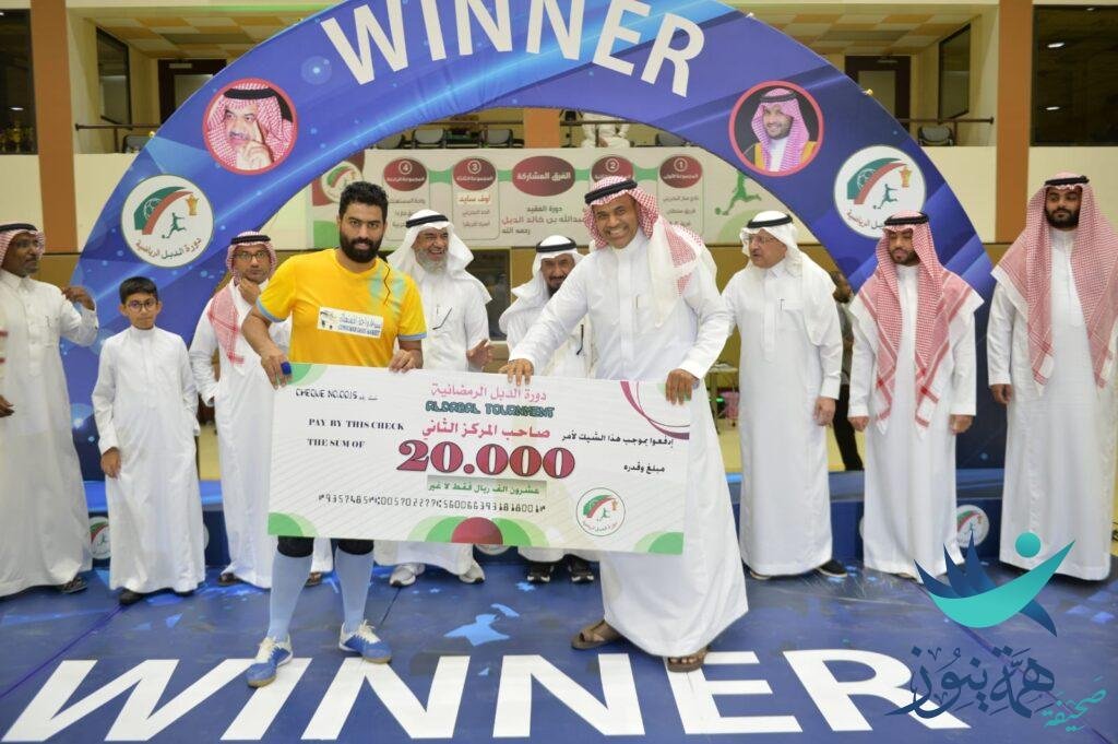 وفي الختام تم تسليم شيك المركز الثاني لفريق واحة المستهلك مبلغ 20 الف ريال قدمه المهندس نواف الدبل ، فتسليم شيك المركز الثاني لفريق المانع مبلغ 30 الف ريال قدمه المهندسين محمد وجمال الدبل