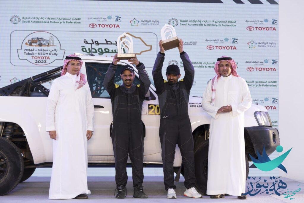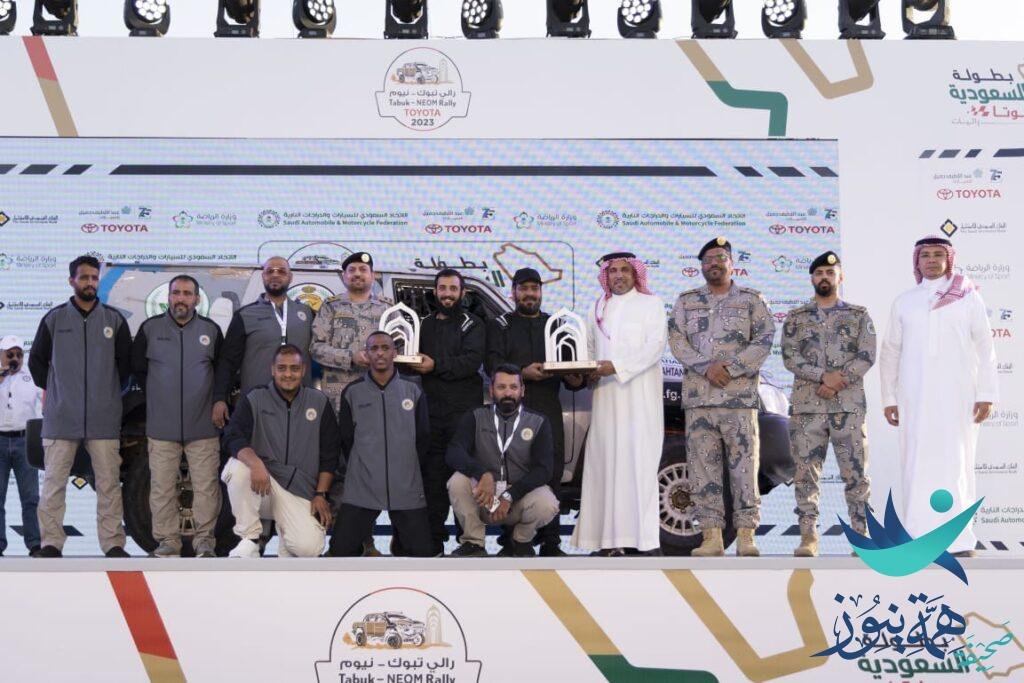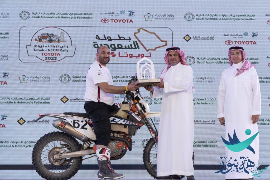 تحت رعاية صاحبِ السموِّ الملكي الأمير فهد بن سلطان بن عبدالعزيز،أمير منطقة تبوك، أختتم الإتحاد السعودي الاتحاد السعودي للسيارات والدراجات النارية – اليوم – منافسات رالي تبوك نيوم في نسخته الأولى، والتي تمثل الجولة الثانية من بُطولة السعودية تويوتا للراليات الصحراوية موسم 2023، التي ينظمها الإتحاد.وقال صاحبُ السموِّ الملكي الأمير خالد بن سلطان بن عبدالله بن فيصل، رئيس مجلس إدارة الاتحاد السعودي للسيارات والدراجات النارية، رئيس شركة رياضة المحركات السعودية في كلمة له – اليوم – خلال الحفل الذي أقيم بهذه المناسبة – بحضور وكيل إمارة منطقة تبوك للشؤون الأمنية أحمد بن مبروك الحجيلي،وعدد من ممثلي مختلف القطاعات الحكومية بالمنطقة:” للمرة الأولى في بطولة السعودية تويوتا عشنا جميعاً أيام من المتعة والندية والحماس، وكما في الأعوام السابقة، عملنا على إضافة مراحل تشكل اختياراً عادلاً وصعباً للمهارات، وتتويج أفضل السائقين والدراجين، فلطالما شكلت بطولة السعودية تويوتا اختباراً حقيقياً للمشاركين .