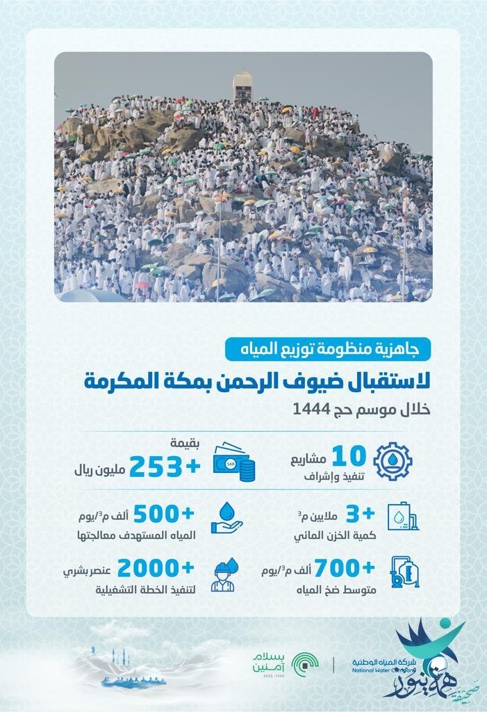 أعلنت شركة المياه الوطنية إكتمال جميع استعداداتها لإدارة قطاعي المياه والخدمات البيئية بمكة المكرمة والمشاعر المقدسة لموسم حج هذا العام 1444هـ، مؤكدة أنها نفذت خطتها التشغيلية والفنية لاستقبال ضيوف الرحمن لهذا الموسم ترجمة لتوجيهات القيادة الرشيدة- حفظها الله- التي تحرص على تسخير جميع الإمكانات والموارد لخدمة حجاج بيت الله الحرام، لتمكينهم من أداء مناسكهم بيسر.