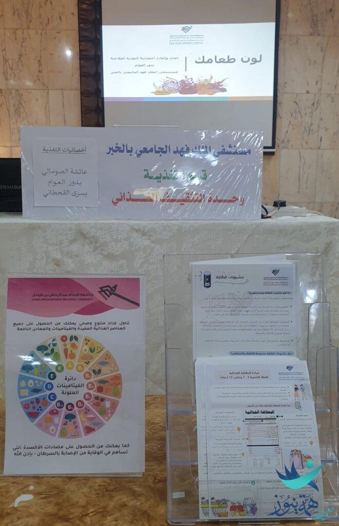 نظمت وحدة التغذية بدار الحضانة الإجتماعية بالدمام وبالتعاون مع وحدة التثقيف الغذائي بمستشفى الملك فهد الجامعي برنامج ( طيف الغذاء ) في صالة الإيمان بالدار استهدف الفتيات والموظفات ،