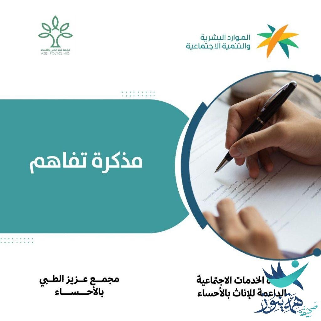وقعت وحدة الخدمات الاجتماعية الداعمة للإناث بالأحساء مذكرة تفاهم مع مجمع عزيز الطبي يوم الاثنين ٢٣ / ١١/ ١٤٤٤ الموافق ١٢ / ٦ / ٢٠٢٣ م، حيث مثل الطرف الأول مديرة الوحدة أ / خزنه بنت عبدالرحمن الرويس ، والطرف الثاني المدير التنفيذي لمجمع عزيز الطبي أ / عادل بن عبدالله النعيم