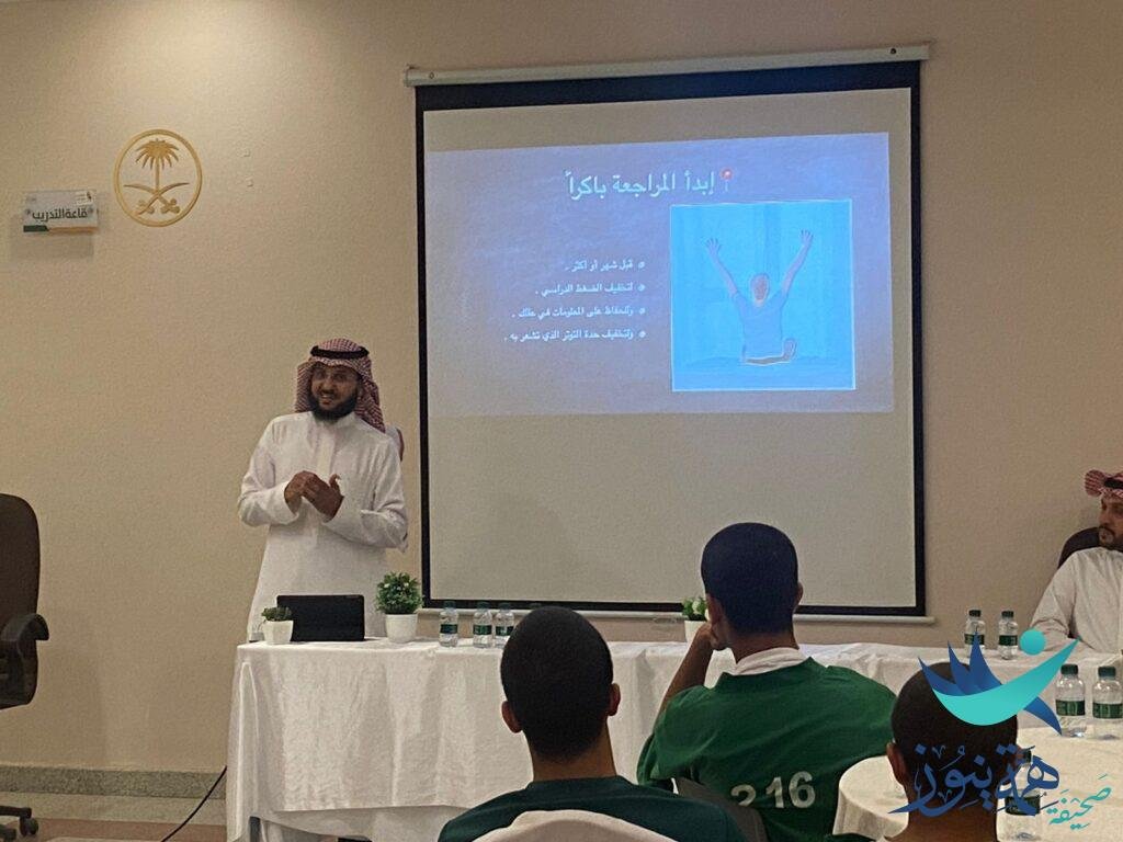 نظمت دار الملاحظة الإجتماعية بحفر الباطن بالتزامن مع قرب الاختبارات النهائية محاضرة بعنوان ( إبدأ المراجعة باكراً ) لنزلاء الدار الملتحقين بمدرسة ابن البيطار قدمها الأستاذ / خلف عبدالله الشيبان تطرق فيها إلى الاستعداد للاختبارات من خلال تنظيم الوقت والدراسة على فترات بأخذ قسط من الراحة من حين لآخر مما يساعد على استعادة التركيز والمراجعة والنوم باكراً وتنظيم الوقت للمذاكرة كلها عوامل تساعد في تخفيف حدة التوتر والقلق اثناء الاختبارات والبعد عن الضغط النفسي من أهم عوامل ضبط النفس والتركيز من خلال المراجعة المنظمة حيث أشار مدير الدار الاستاذ فهد الشمري إلى أن الهدف من هذه المحاضرة تهيئة الطلاب نفسياً للاستعداد للاختبارات بإدخال شعور التفاؤل لديهم وتهيئة الجو المناسب لهم للدراسة والمذاكرة وتقديم أفضل سبل الراحة والاهتمام من خلال متابعتهم بشكل يومي من قبل فريق العمل من الاخصائيين داخل الدار متمنين لهم التوفيق والنجاح .