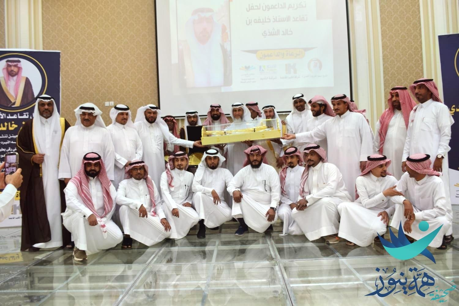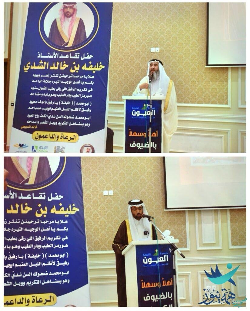 وبعد ذلك كلمة المحتفى به الاستاذ خليفة الشدي الذي شكر الحضور على تلبيتهم الدعوة وبعد ذلك تحدث مدير مكتب التعليم الشمال الاستاذ خالد السليم الذي اشاد بجهود الاستاذ خليفة الشدي في الإدارة واضاف ان الاستاذ خليفة كان يتصف بالحكمة في الإدارة وتعاونه الاخلاقي مع زملائه وهذا ماجعله يحقق كثير من الإنجازات .