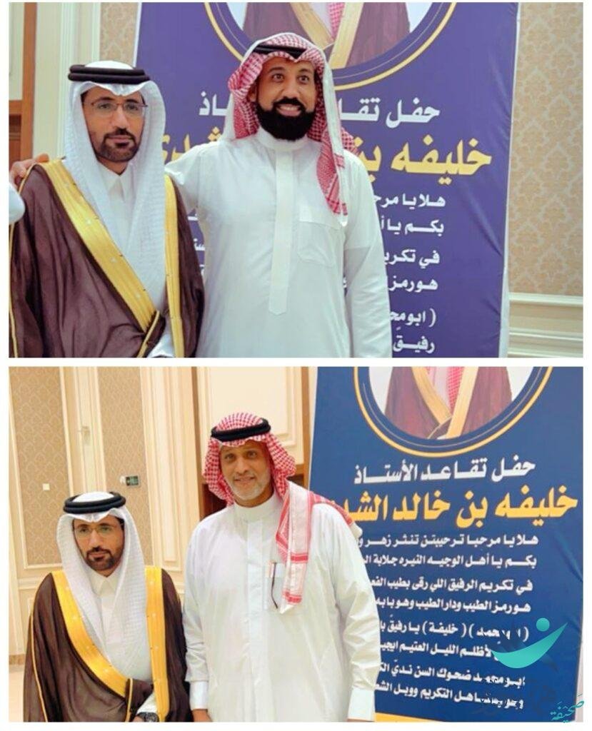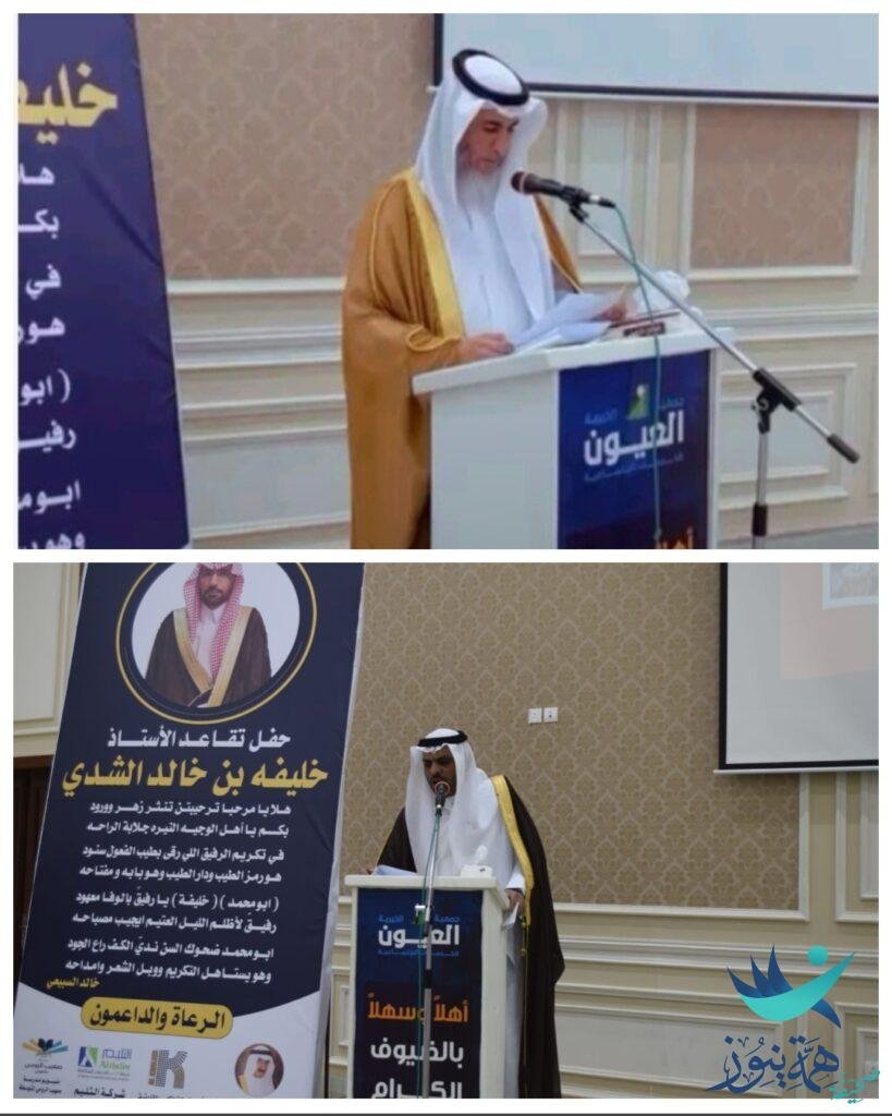 في لليلة من ليالي الفرح والسرور والبهجة والسعادة والوفاء…. احتفل منسوبي مدرسة صهيب الرومي المتوسطة بالعيون بتقاعد المربي الفاضل مدير المدرسة الاستاذ خليفه بن خالد الشدي بعد أن أمضى في سلك التعليم ٣٠سنة تاركاً خلفه تاريخ حافل بالإنجازات والعطاء سجلت في سجلة التعليمي وذلك بحضور مدير مكتب التعليم بشمال الأحساء سعادة الأستاذ خالد بن حمد السليم ونائبة الأستاذ صالح المرشد ومدير مكتب التعليم بالمبرز الأستاذ عمر الحسن ومجموعة كبيرة من المشرفين التربويين ورجالات التعليم والاصدقاء والاقارب وطلاب المحتفى به