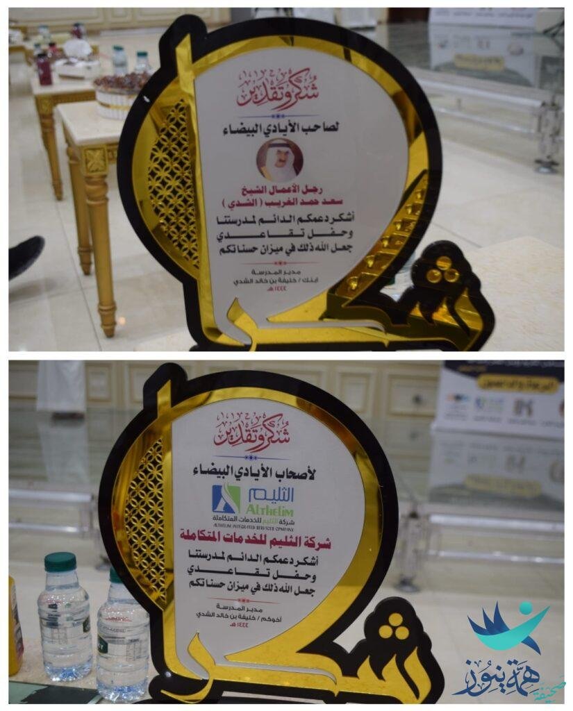 وتم تكريم رعاة الحفل وهم رجل الاعمال الاستاذ سعد الغريب الشدي وشركة الثليم وشركة الكليب القابضه . ومنسوبي مدرسة صهيي الرومي. وتم تقديم الهدايا للمحتفى به من قبل زملائه المعلمين والاصدقاء والاقارب والمحبين وتناول الجميع وجبه العشاء بهذه المناسبة .