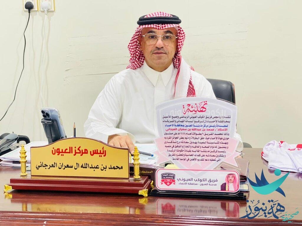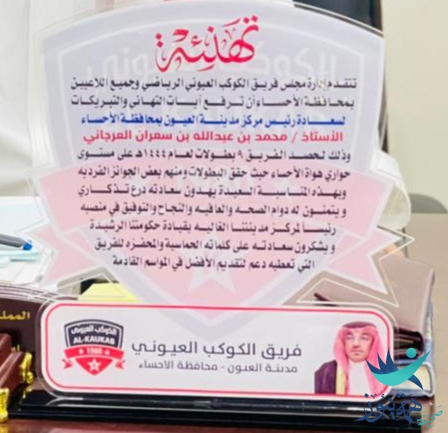 أستقبل رئيس مركز مدينة العيون وما جاورها بمحافظة الأحساء سعادة الأستاذ محمد بن عبدالله بن سعران العرجاني ظهر يوم أمس الخميس الموافق ١٧ اغسطس لعام ٢٠٢٣م في مقر المركز بمدينة العيون بعض من اعضاء ولاعيبة فريق الكوكب العيوني الرياضي في مدينة العيون بالأحساء احد أبطال فرق الهواة بمحافظة الأحساء وذلك لعرض البطولات التي انجزها الفريق خلال عام ١٤٤٤هـ بما فيها تقديم كأس البطوله الذي حصل علية الفريق في دورة شعباوي ٣….وكذلك حصل مدرب الفريق الكابتن حمد بن عبدالله العيد على أفضل مدرب في البطوله وكذلك الكابتن عبدالله العراده على هداف الدوره…