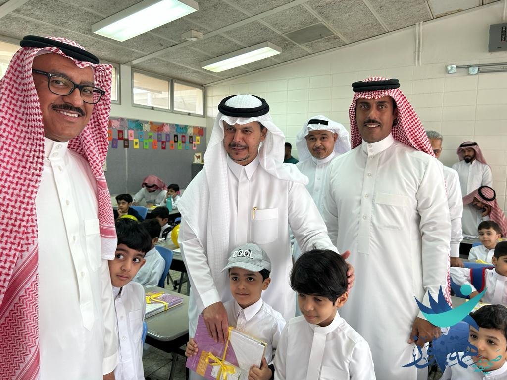 في إستقبال أبنائه الطلاب مع منسوبي مدرسة ابن الهيثم الابتدائية بحي التعاون بمدينة الهفوف التابعة لمحافظة الاحساء بقيادة الأستاذ ‘ خالد بن مبارك المحارفي’في اليوم الأول من الدراسة.