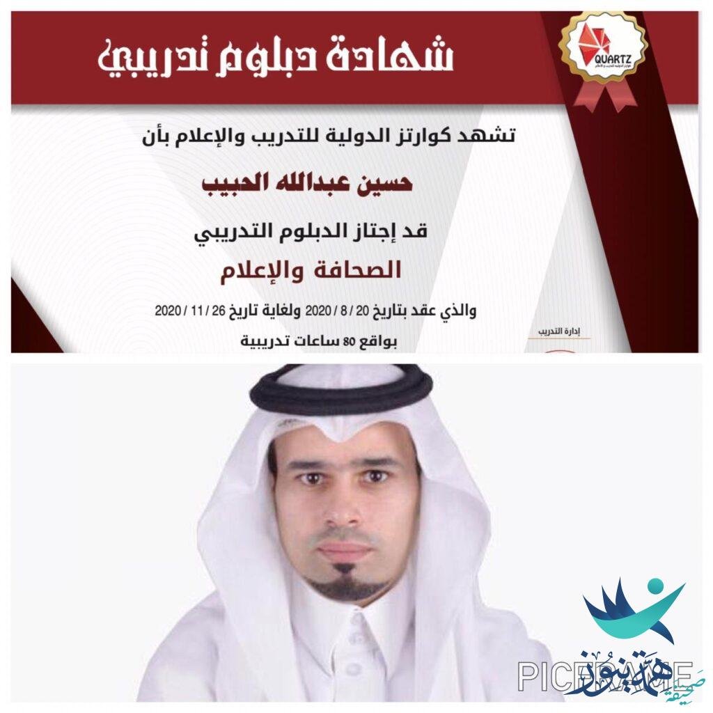 حصل الإعلامي حسين الحبيب على شهادة الدبلوم التدريبي للصحافة والإعلام من معهد كوارتز الدولية للتدريب والإعلام لمدة ثلاث شهور،