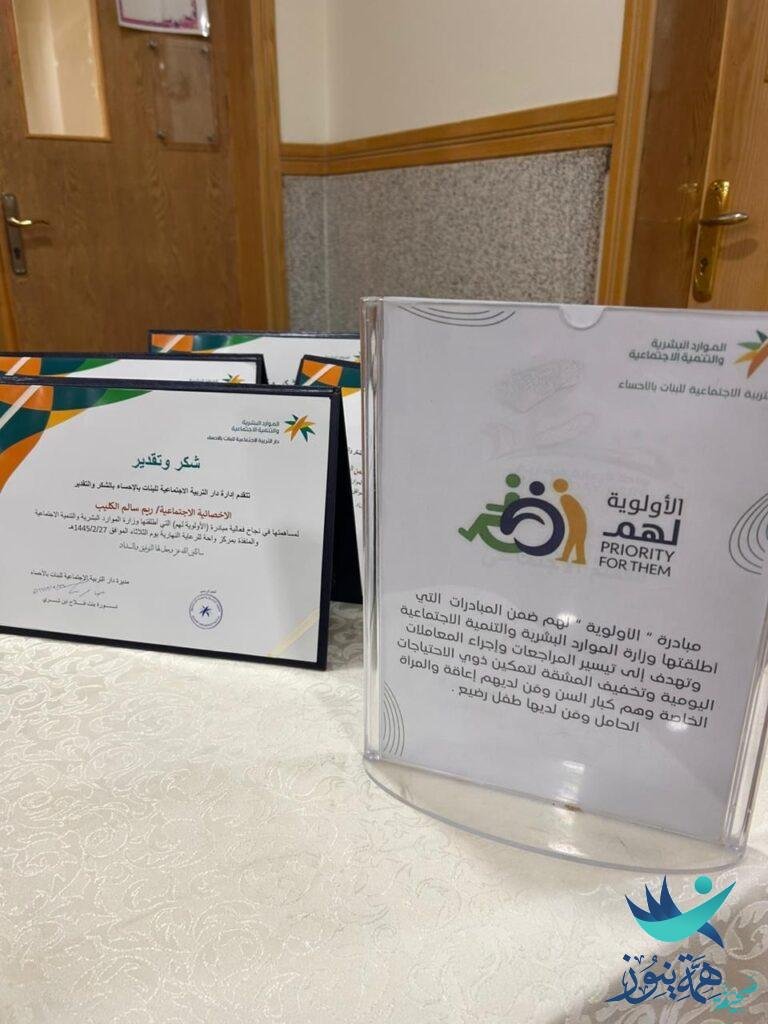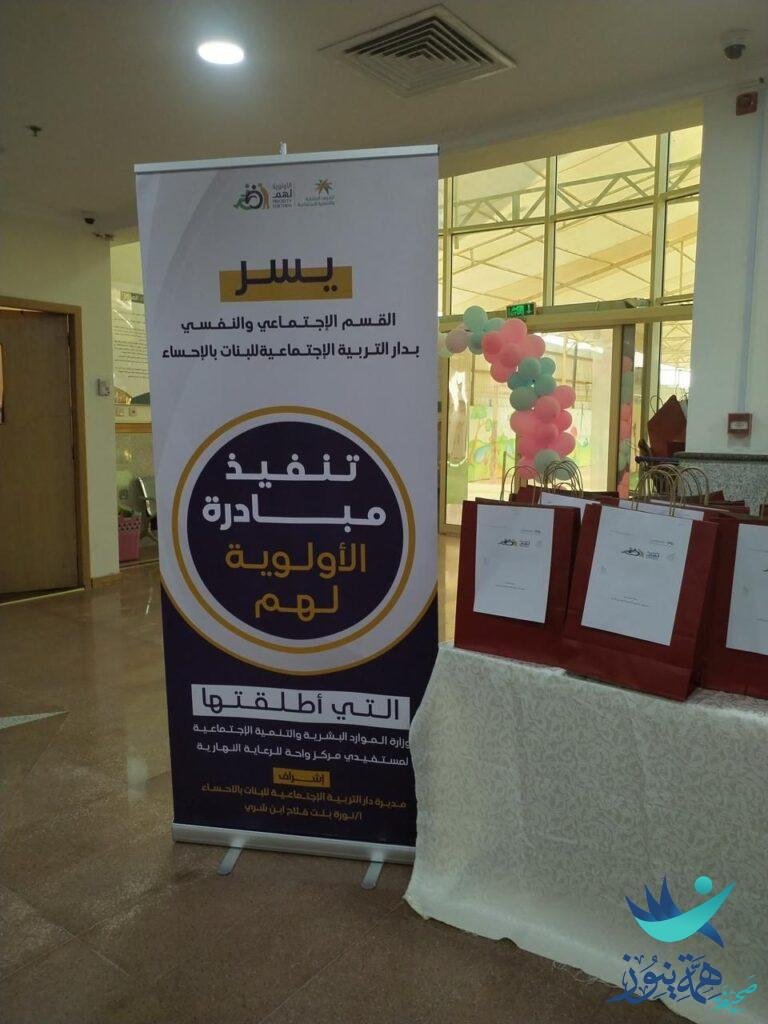 فعلت دار التربية الإجتماعية للبنات بالأحساء مبادرة اجتماعية إنسانية وطنية بعنوان ( الأولية لهم ) التي اطلقتها وزارة الموارد البشرية والتنمية الاجتماعية التي تعنى بدعم وتمكين مستفيدي الوزارة ذوي الأحتياجات الخاصة من كبار السن وذوي الإعاقة من الأطفال والمرأة الحامل والمرضع وتعزيز الصورة الذهنية لهم وتهيئة الامكان والمرافق العامة واحترامهم وتسهيل معاملتهم وتوفير البيئة المكانية المناسبة لهم مع مركز واحة للرعاية النهارية احدى المراكز التي تعنى بخدمة الاطفال ذوي الاعاقة يوم الثلاثاء ٢٧ /٢ /١٤٤٥هـ .