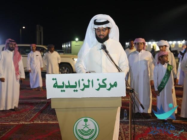 وبدأ الحفل بالسلام الملكي ثم تلاوة عطرة من آيات الذكر الحكيم تلاها القارئ عبد العزيز بن راشد المري ثم بعد ذلك ألقى رئيس مركز الزايدية الأستاذ متعب بن راشد المري كلمة رحب من خلالها بالحضور أحر ترحيب وشكرهم على تلبية الدعوة لحضورهم ومشاركتهم بالاحتفال بهذه المناسبة الوطنية الغالية على الجميع ورفع باسمة ونيابة عن جميع الجهات الحكومية وأهالي مركز الزايدية أسمى آيات التهاني والتبريكات لمقام خادم الحرمين الشريفين الملك سلمان بن عبدالعزيز آل سعود أيده الله وإلى صاحب السمو الملكي الأمير محمد بن سلمان بن عبدالعزيز آل سعود ولي العهد رئيس مجلس الوزراء حفظه الله وإلى صاحب السمو الملكي الأمير عبدالعزيز بن سعود بن نايف وزير الداخلية حفظه الله وإلى صاحب السمو الملكي الأمير سعود بن نايف بن عبدالعزيز آل سعود أمير المنطقة الشرقية حفظه الله وإلى صاحب السمو الملكي الأمير أحمد بن فهد بن سلمان نائب أمير المنطقة الشرقية حفظه الله وإلى صاحب السمو الملكي الأمير سعود بن طلال بن بدر آل سعود محافظ الاحساء حفظه الله ـ بمناسبة اليوم الوطني ٩٣ تحت شعار : ( نحلم ونحقق ) الذي يدعي الجميع للعمل الجاد لتحقيق أحلام وأهداف ورؤية القيادة الكريمة ، ومواصلة البناء والتنمية لرفعة شأن الوطن