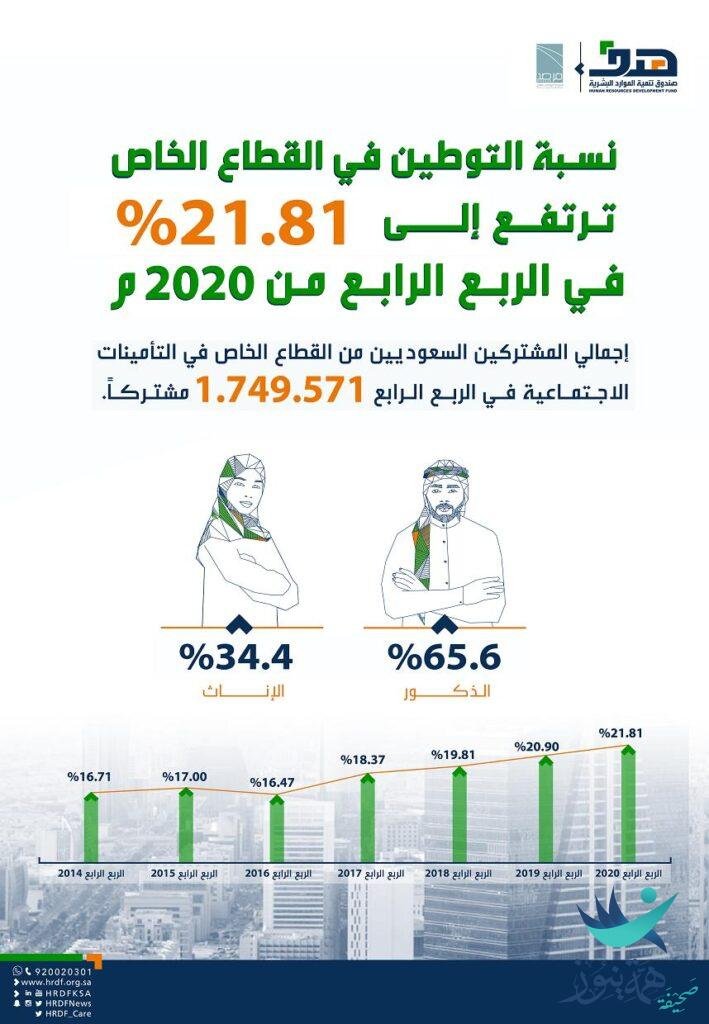 أكد المرصد الوطني للعمل التابع لصندوق تنمية الموارد البشرية (هدف)، ارتفاع معدل التوطين في منشآت القطاع الخاص خلال الربع الرابع من العام الماضي (2020) إلى 21.81 في المائة من إجمالي العاملين في القطاع الخاص، مقارنة بـ 20.90 في المائة من الربع نفسه من 2019، و 19.81 في المائة في 2018، و18.37 في المائة في 2017، و 16.47 في المائة في 2016، و 17 في المائة في 2015م.