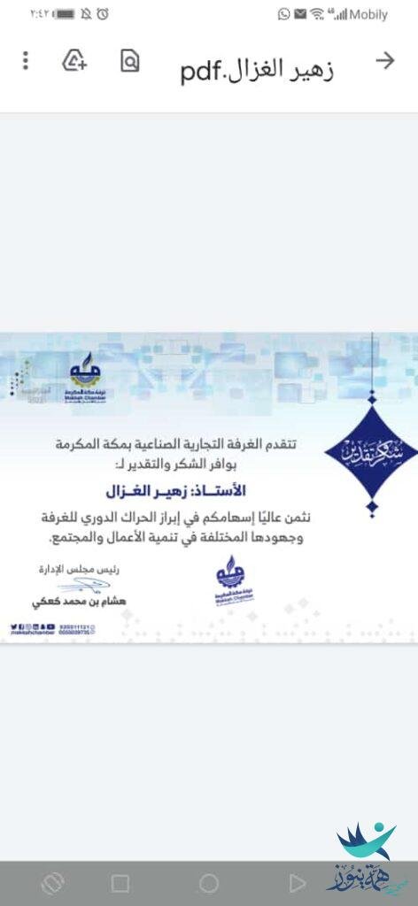 زهير بن جمعه الغزال الإعلامي بالمنطقة الشرقية تقديراً لمساهمته في إبراز الحراك الدوري للغرفة وجهودها المختلفة في تنمية الأعمال والمجتمع .