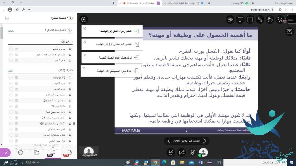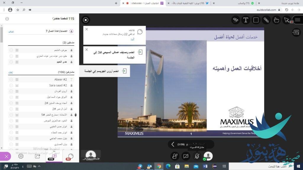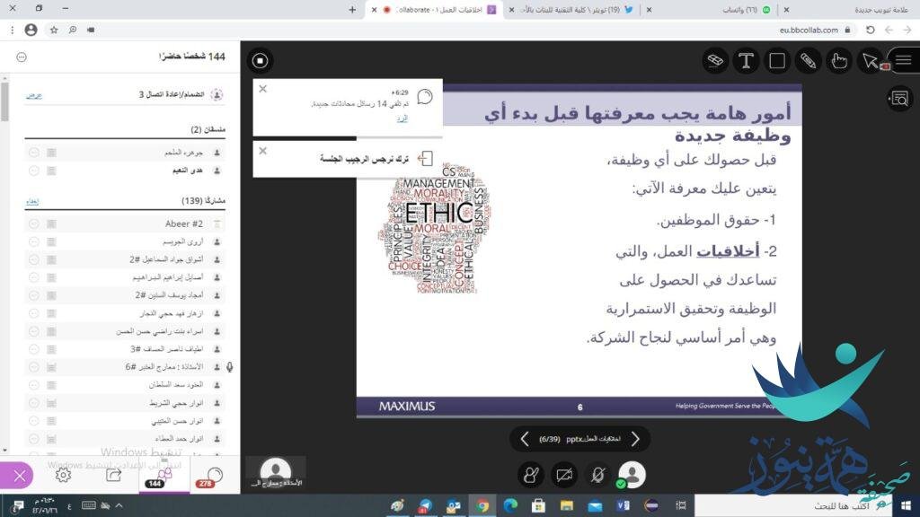 نفذت الكلية التقنية للبنات بالأحساء ممثلة بمكتب التوجيه المهني والتنسيق الوظيفي ، برنامج اخلاقيات العمل عن بُعد لخريجات الكلية والمتدربات المقبلات على التخرج وذلك مساء يوم الأثنين الموافق 26/06/1442هـ من خلال منصة البلاك بورد، بهدف التعريف بالقيم التي تتمحور حول أهمية العمل وانعكاس هذه القيم على الرغبة بالعمل والإصرار على الإنجاز.