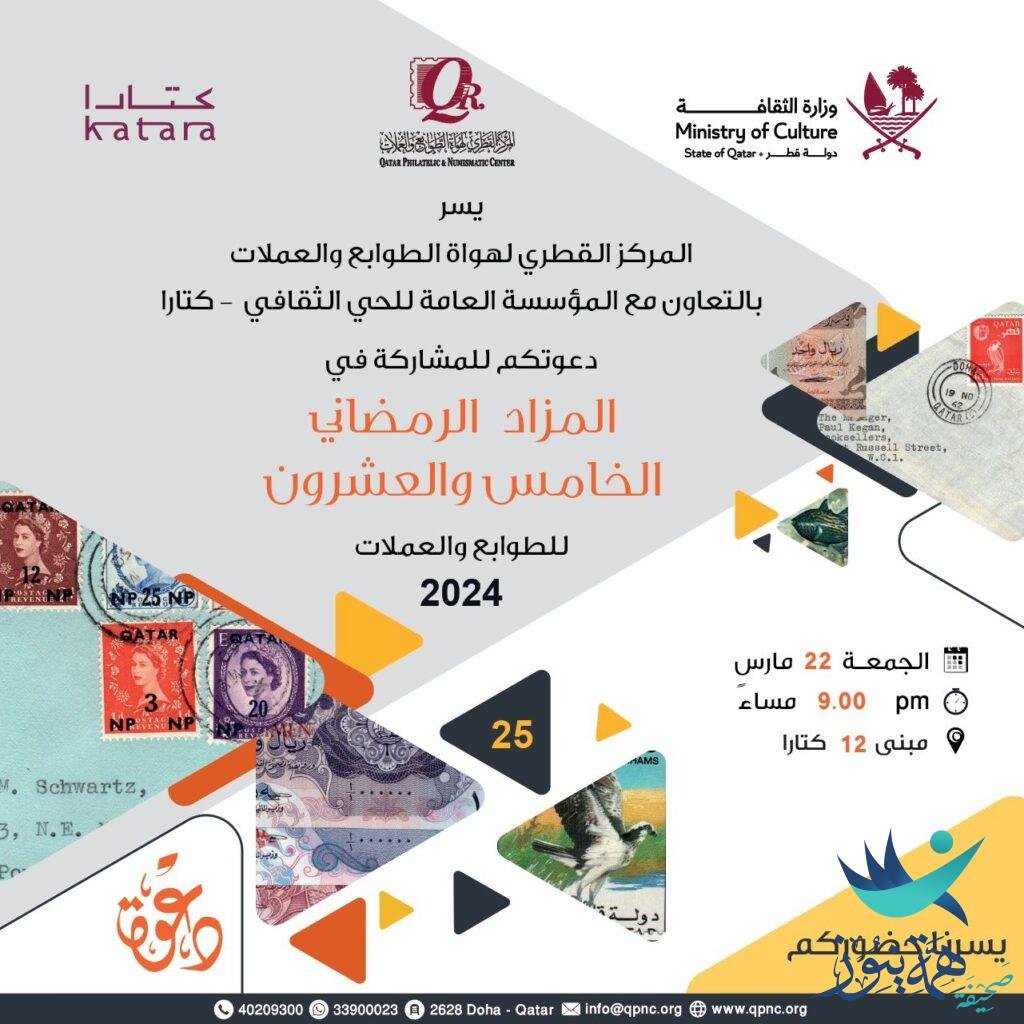 ينظم المركز القطري لهواة الطوابع والعملات وبالتعاون مع المؤسسة العامة للحي الثقافي – كتارا المزاد الرمضاني الخامس والعشرون للطوابع والعملات 2024