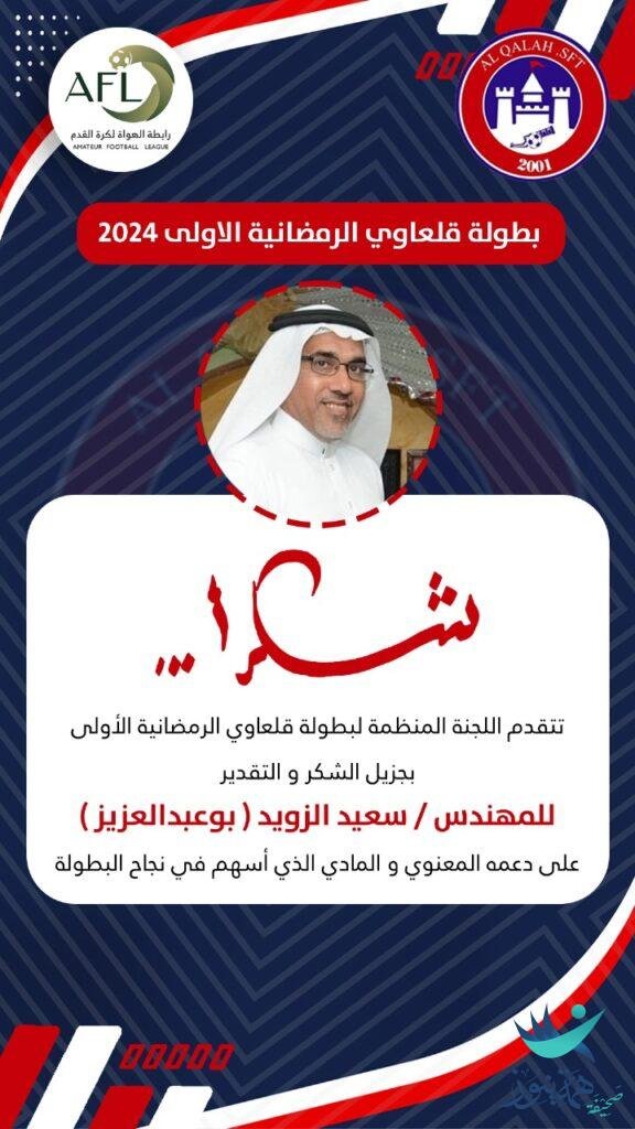 الراعي الرسمي للبطولة مطعم تكة بابا وكذلك الداعم الاستاذ – علي بن احمد القطان … وكذلك المهندس سعيد الزويد بو عبدالعزيز وغيرهم ….
