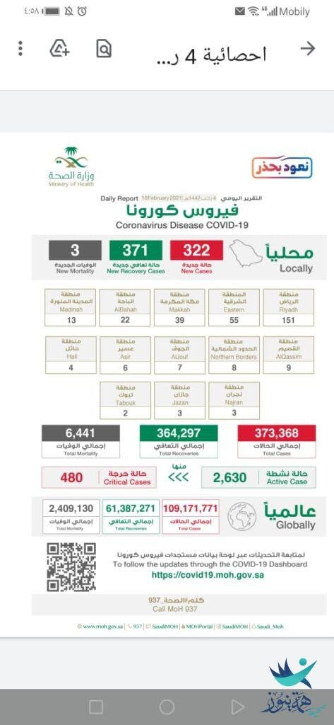 وأضاف د/ العبدالعالي أنه تم تسجيل 322 حالة جديدة لفيروس كورونا الجديد (COVID -19) ليصبح إجمالي عدد الحالات المؤكدة في المملكة (373368) حالة، من بينها (2630) حالة نشطة لاتزال تتلقى الرعاية الطبية، ومعظمهم حالتهم الصحية مطمئنة، منها (480) حالة حرجة.