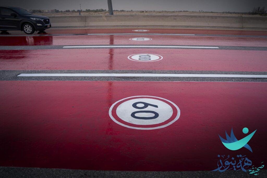 يُذكر أن الموقع المُحدد بهذه الخاصية في الطريق يتشكل من مجموعة من عناصر السلامة والعلامات المرورية الأرضية ويتضمن ذلك ( علامات مسبقة الصنع لـ” حد السرعة الجديدة “، مسار دهان احمر بارد ثنائي المُكون ).
