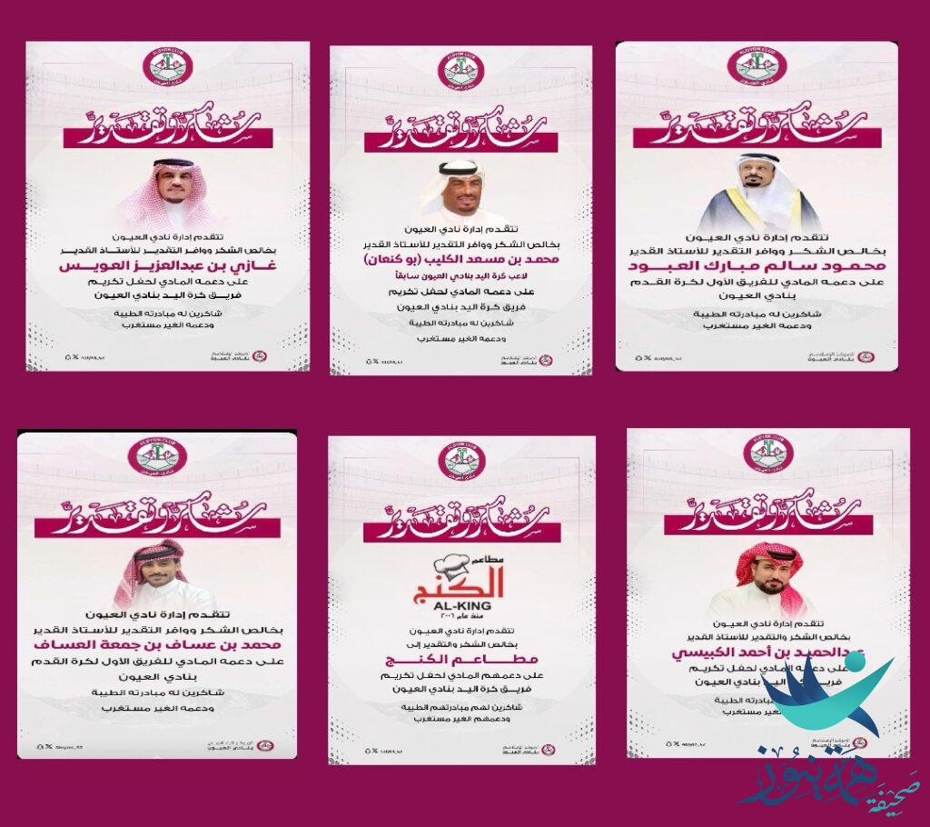 يتقدم اعضاء مجلس إدارة نادي العيون السعودي بمدينةالعيون بمحافظة الأحساء بعظيم الشكر وأسمى آيات العرفان لجميع الداعمين على ما يقدمونه من دعم ومؤازرة ومساعدات لصالح نادي العيون السعودي نادي الجميع.