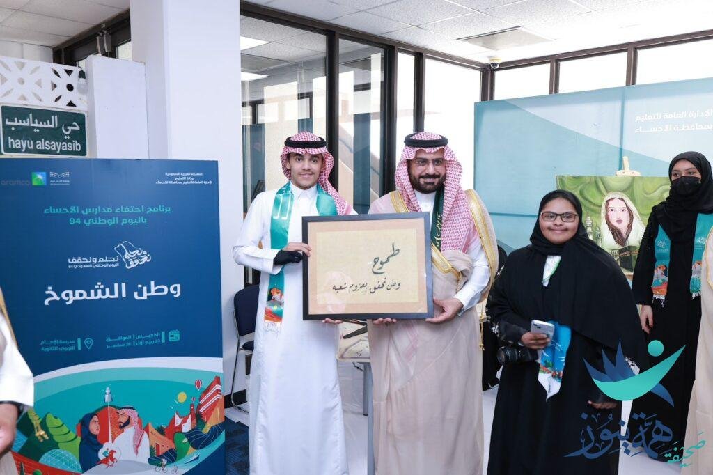 برعاية صاحب السمو الملكي الأمير سعود بن طلال بن بدر محافظ الأحساء ، شهد سعادة وكيل محافظة الأحساء الأستاذ معاذ بن إبراهيم الجعفري ، اليوم ” الخميس ” ، حفل الإدارة العامة للتعليم بالمحافظة ، بشراكه مع ارامكو السعودية ، بمناسبة اليوم الوطني الـ 94، وذلك في مدرسة الإمام النووي الثانوية ،