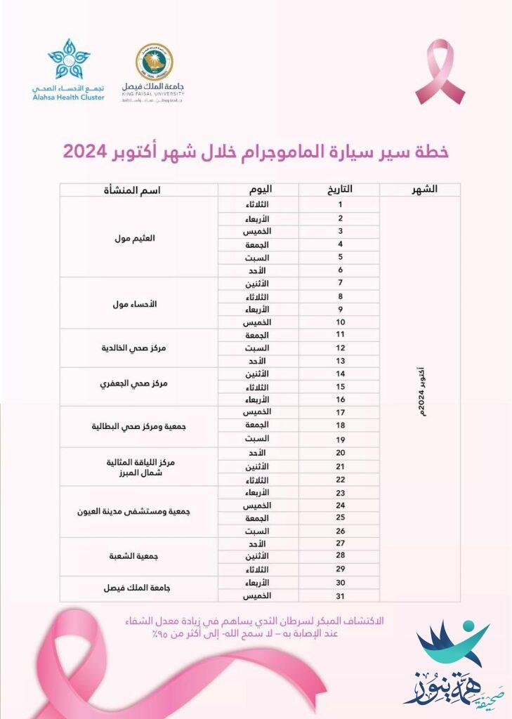 وتكون هناك خطة لسير سيارة الماموجرام خلال شهر اكتوبر وهي سيارة متنقله يتم من خلالها الكشف عن سرطان الثدي ويوجد ايضاً مراكز لأجراء الكشف المبكر عن سرطان الثدي اعاذنا الله واياكم منه .