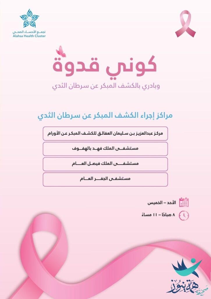 يذكر ان التجمع الصحي يقوم بهذه الحملة للكشف المبكر لسرطان الثدي خلال شهر اكتوبر في عدة مواقع وهي :