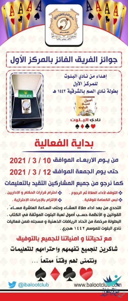 يطلق نادي الصم في المنطقة الشرقية وبالتعاون مع نادي البلوت الاربعاء القادم بطولة البلوت لعام ١٤٤٢ وتستمر ثلاثة أيام وذلك ضمن برامج النادي الترفيهية خلال هذا الموسم.