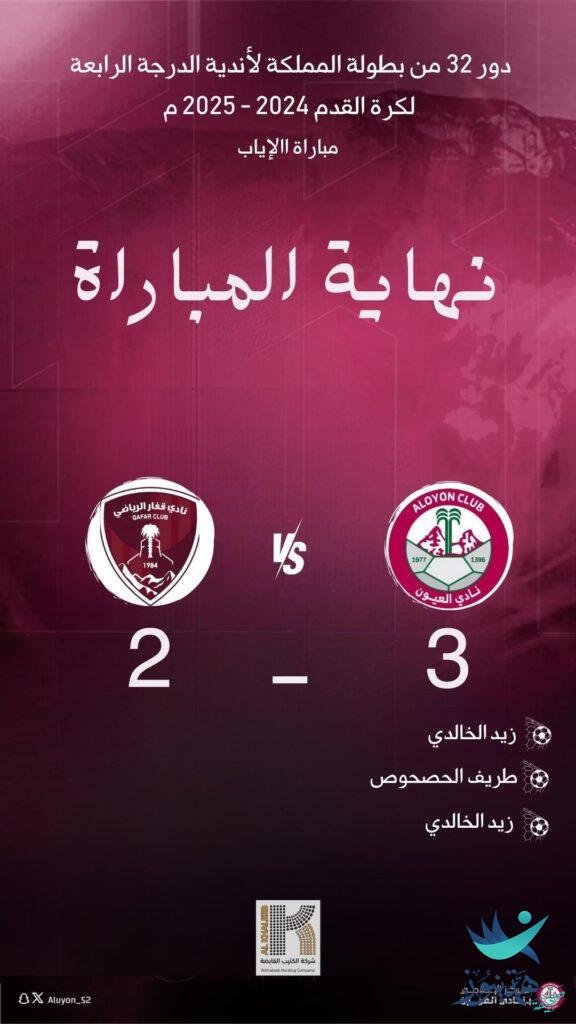 في مباريات الدرجة الرابعه حقق الفريق الأول لكرة القدم بنادي العيون السعودي بمدينة العيون بمحافظة الأحساء فوزا ثميناً على فريق قفار بنتيجة قوامها ثلاث أهداف مقابل هدفين في تصفيات الصعود. لدوري الدرجة الثالثة في المباراة التي جمعت بينهما على ملعب