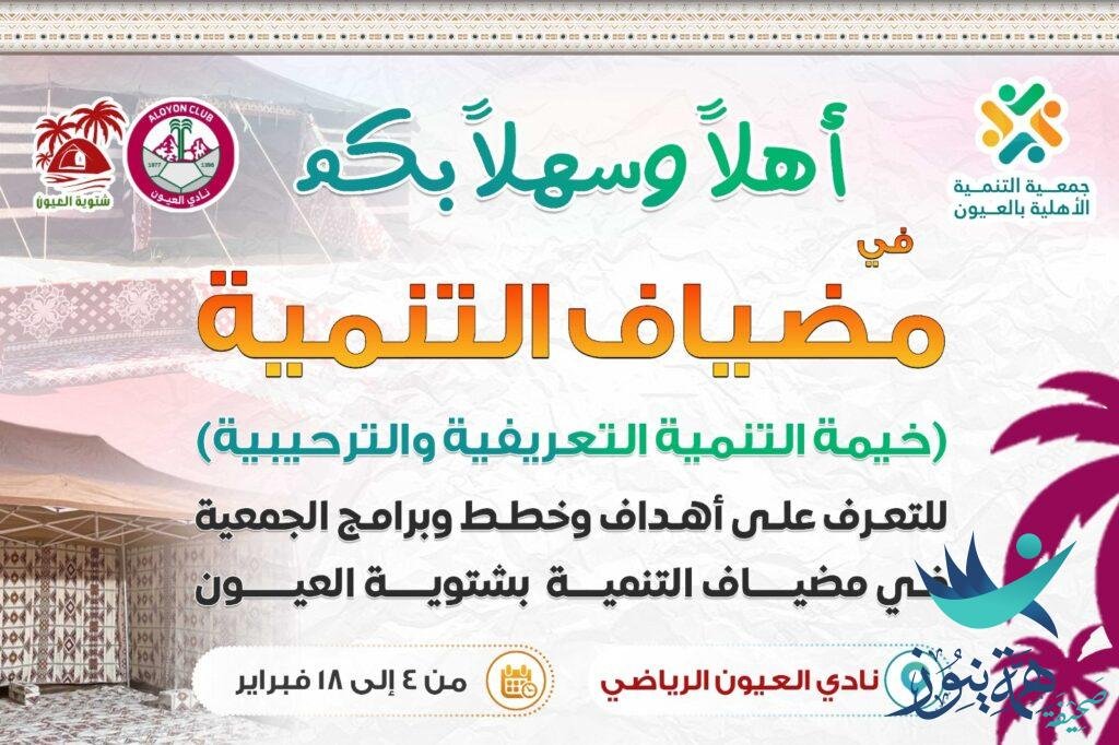افتتحت جمعية التنمية الأهلية بالعيون بمحافظة الأحساء برنامج خيمة التنمية التعريفية والترحيبية المصاحب لمهرجان شتوية العيون في نادي العيون وذلك