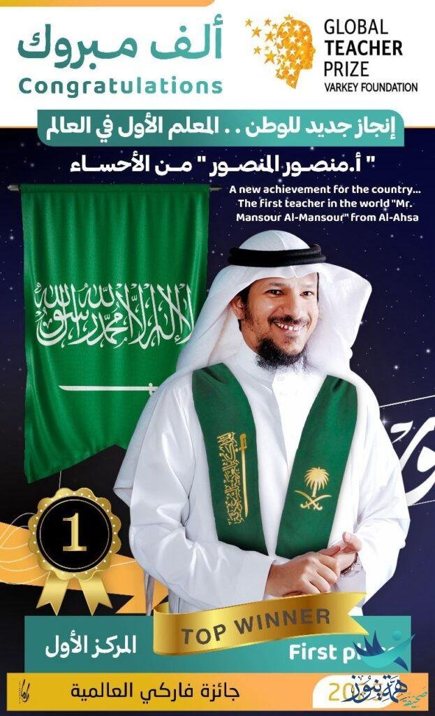 يحق لنا نحن العرب والمسلمين وسعوديين أن نفتخر ونفرح بهذا الانجاز العظيم الذي حققه ابن المملكة العربية السعودية ابن محافظة الأحساء الأستاذ الفاضل منصور عبدالله المنصور( المركز الأول) على المستوى العالمي تحقيقه بكفاءة وجدارة وجد واجتهاد افضل معلم على مستوى العالم
