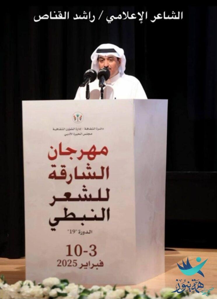 شارك الشاعر الاعلامي الاستاذ راشد عبدالرحمن القناص في مهرجان الشارقه للشعر النبطي في دورته ال 19الذي نظمته دائرة الثقافة في الشارقة على مدى 8 أيام بمشاركة أكثر من 60 شاعراً وشاعرة وناقداً وإعلامياً يمثلون الدول العربية.