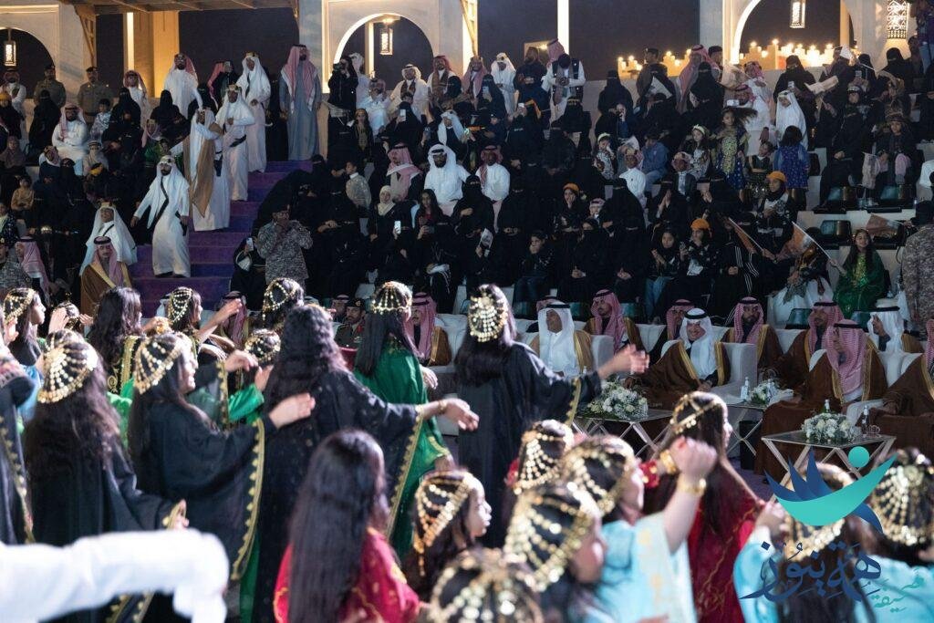 وتضمن الحفل عروضًا وطنية متنوعة، مثل المعزوفات الوطنية والعرضة السعودية، بالإضافة إلى أوبريت “درع حصين”، كما شهد المهرجان مسيرة حاشدة بالقرب من الأسوار الخارجية لموقع المهرجان، تضمنت عروض الخيالة والعرضة السعودية وعروض رجال العسس، كما تفاعل الحضور مع المعزوفات الوطنية التي قُدمت في ساحة المهرجان ، وخُصِّص أركان احتفائية بيوم التأسيس في الموقع، مثل منصات الأزياء الشعبية، وخيمة القهوة السعودية، وركن السيارات الكلاسيكية ، وحرص العديد من الزوار على ارتداء الأزياء الخاصة بهذا اليوم في مشهد ارتسمت فيه البهجة على الجميع