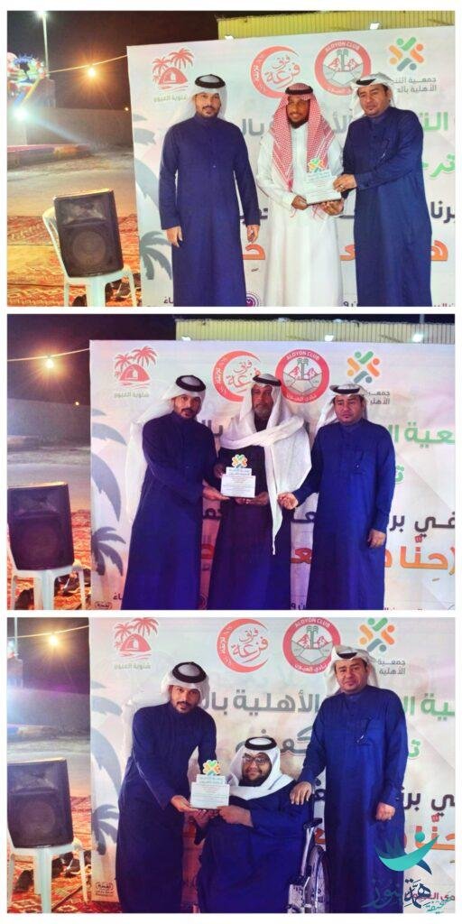 وفي كلمة لرئيس الجمعية ألاستاذ عصام عبدالله الكليب شكر فيها الحضور وما قاموا به من أعمال جليلة في تنمية الفرد والمجتمع و أن ما تقوم به الجمعية في هذا البرنامج ماهو إلا تأكيد العادات الحميدة في مجتمعنا ومنها المبادرة في العمل المجتمعي والتعاون والتعاضد ولذلك تم تكريم من له إسهامات جليلة في تنمية مجتمعنا إدارياً وميدانياً من حيث عدد السنوات التي قضاها وتعدد المجالات ومازال في ميدان العطاء أو تحقيقهم جوائز شخصية على مستوى المحافظة أو المملكة تلمس تنمية المجتمع بشكل عام