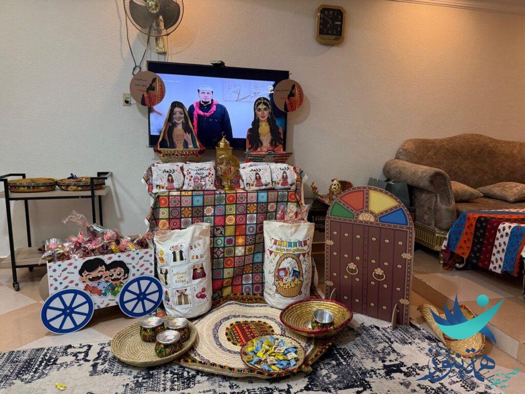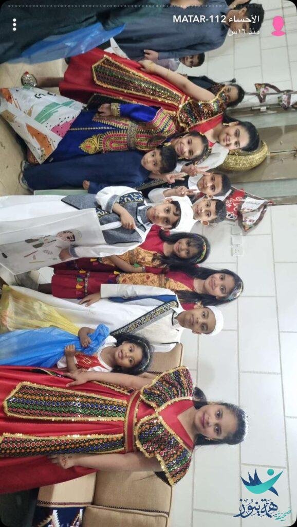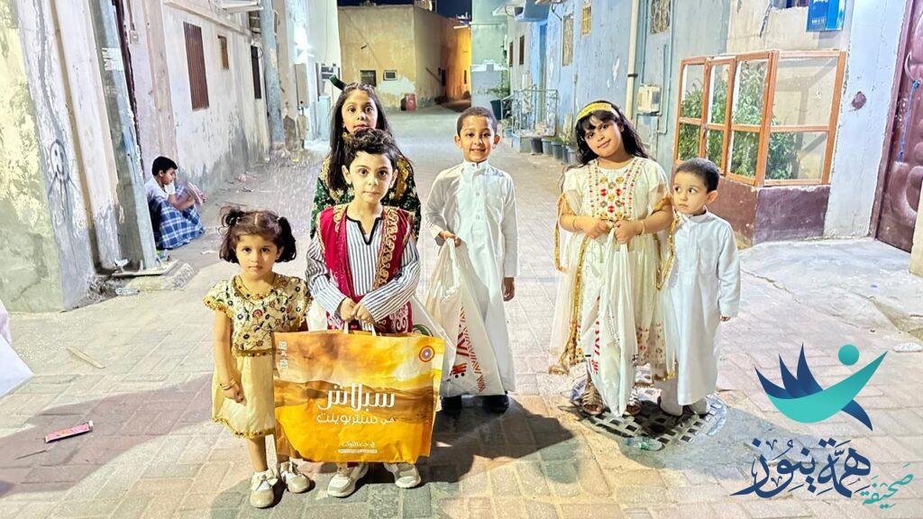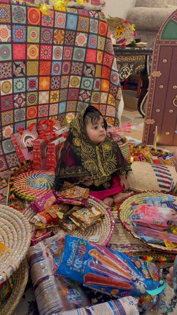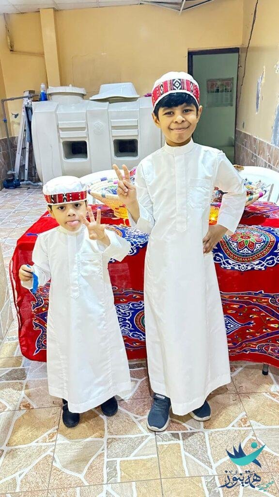 ويحرص الأطفال على لبس الملابس الشعبية فيلبس الأولاد الطاقية والدشداشة والإزار ، بالإضافة إلى النعال الشعبية .. أما البنات فيلبسن الدراعات التراثية والبخنق وهما :