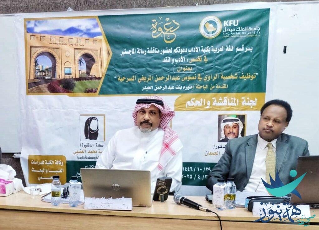 نوقشت صباح الأحد الموافق 29 شوال 1446 بكلية آداب جامعة الملك فيصل رسالة علمية مقدمة لنيل درجة الماجستير للطالبة الباحثة منيرة عبد الرحمن الحيدر وهي بعنوان توظيف شخصية الراوي في نصوص عبد الرحمن المريخي المسرحية، والرسالة تحت إشراف الأستاذ الدكتور سامي بن عبد اللطيف الجمعان أستاذ الأدب والنقد المسرحي بجامعة الملك فيصل ، وشاركه المناقشة كل من: الأستاذ الدكتور عادل الهادي أستاذ الأدب والنقد بجامعة الملك فيصل قسم اللغة العربية، والدكتورة حورية محمد العتيبي أستاذة الأدب والنقد بجامعة الفيصل بالدمام