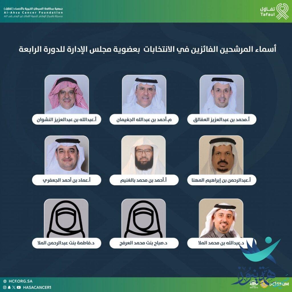 وقد تم الإعلان عن أسماء الفائزين في مجلس الإدارة الجديد لدورته الرابعة عبر الموقع الرسمي للجمعية وحساباتها على وسائل التواصل الاجتماعي.