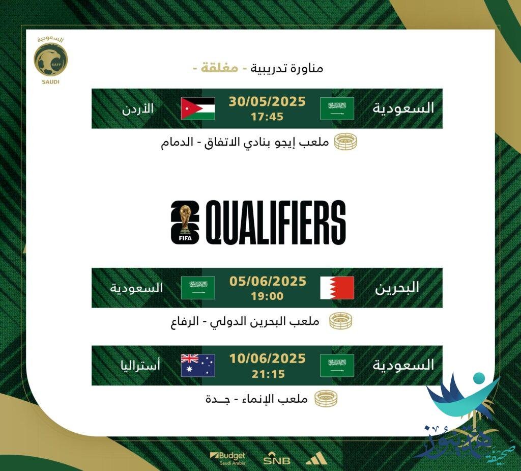 يقيم المنتخب الوطني معسكرًا إعداديًا في مدينة الخبر خلال الفترة من 27 مايو إلى 3 يونيو استعدادًا لخوض الجولة التاسعة أمام منتخب البحرين والجولة العاشرة أمام منتخب أستراليا ضمن التصفيات الآسيوية المؤهلة لكأس العالم 2026، وسيخوض الأخضر خلال معسكره مناورة ودية تدريبية ( مغلقة ) أمام منتخب الأردن ستقام عصر الثلاثين من شهر مايو الجاري على ملعب إيجو بنادي الاتفاق .