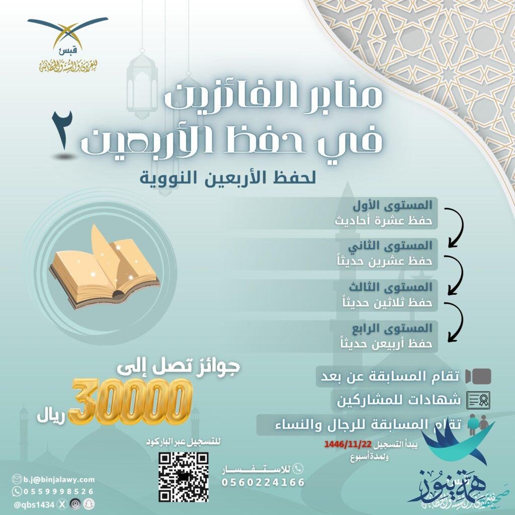 أطلقت جمعية قبس للقرآن والسنة والخطابة النسخة الثانية من مسابقة “منازل الفائزين في حفظ الأربعين النووية”، والتي تهدف إلى نشر السنة النبوية وتحفيز الفتيان والفتيات على حفظ أحاديث الرسول ﷺ، بأسلوب تعليمي حديث وميسر، بدعم من مؤسسة السبيعي الخيرية.