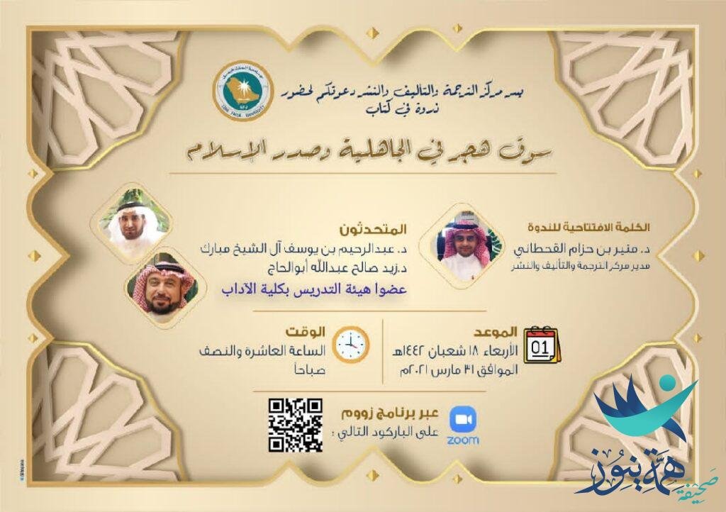 يقيم مركز الترجمة والتأليف والنشر بجامعة الملك فيصل ندوة تعريفية لكتاب: (سوق هجر في الجاهلية وصدر الإسلام) ، حيث تبدأ الندوة في تمام الساعة العاشرة والنصف من صباح يوم الأربعاء 18 شعبان 1442هـ الموافق 31 مارس 2021م بمقر مركز الترجمة والتأليف والنشر عبر الإتصال المرئي. وتأتي إقامة هذه الندوة في إطار الأنشطة التي يقيمها المركز وتهدف إلى المساهمة في نشر المعرفة التي تخدم المجتمع من خلال إقامة ورش العمل والندوات لتسليط الضوء على الكتب التي يصدرها المركز ، والندوة هي قراءة في أحدث كتب إصدارات مركز الترجمة والتأليف والنشر ويحمل عنوان: (سوق هجر في الجاهلية وصدر الإسلام) وهو من إعداد سعادة الدكتور عبدالرحيم بن يوسف آل الشيخ مبارك، وسعادة الدكتور زيد صالح عبدالله أبوالحاج، عضوا هيئة التدريس بقسم الدراسات الإجتماعية بكلية الآداب بجامعة الملك فيصل.