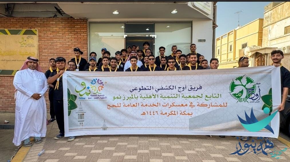 فريق ( أوج) الكشفي التابع لجمعيه التنميه الاهليه بالمبرز ( نمو) انطلق بحفظ الله ورعايته عصر يوم الثلاثاء ١١/٢٧/١٤٤٦ الفريق الكشفي وعددهم ( ٦٤) عضو كشفي للمشاركه في خدمه حجاج بيت الله الحرام لهذه السنه ١٤٤٦