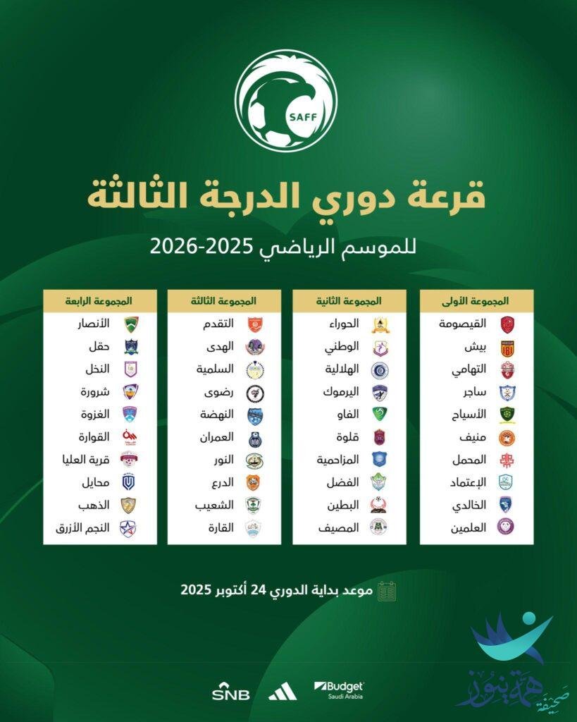 أسفرت قرعة دوري الدرجة الثالثة السعودي لكرة القدم و التي اقيمت ظهر اليوم الأربعاء 28 / 5 / 2025 م عن وقوع نادي الفضل في المجموعة الثانية التي ضمت معه كل من أندية ( الحوراء ، الوطني ، الهلالية ، اليرموك ، الفاو ، قلوة ، المزاحمية ،البطين ، المصيف ).