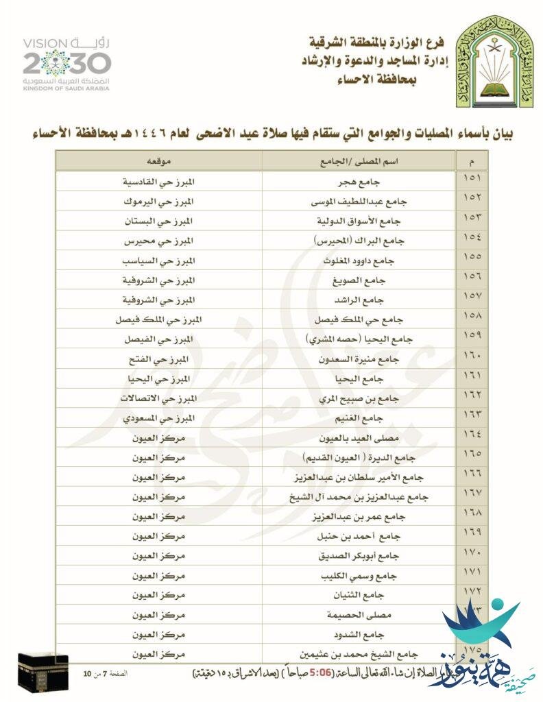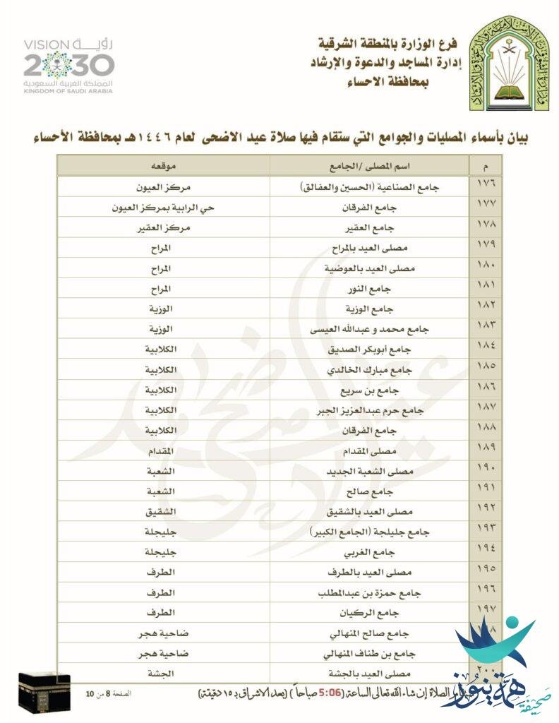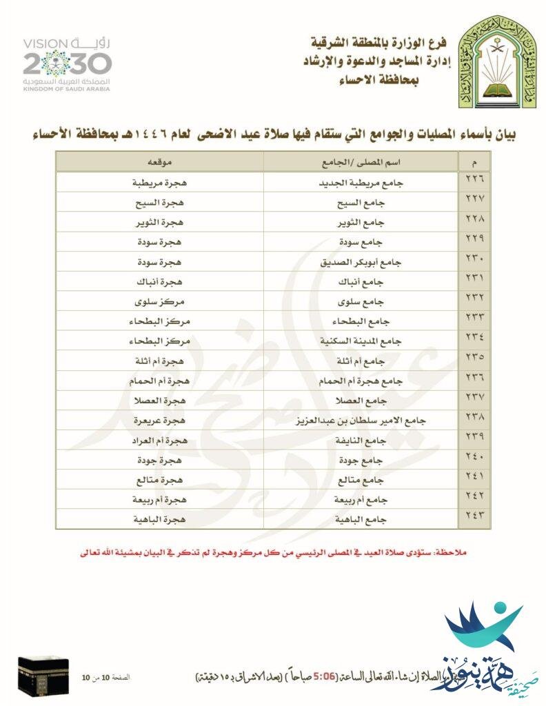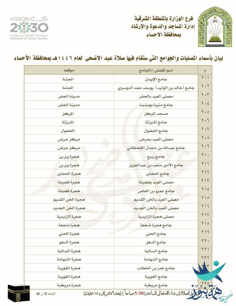أعلن فرع وزارة الشؤون الإسلامية والدعوة والإرشاد بالمنطقة الشرقية، بيان بأسماء المصليات والجوامع التي ستقام فيها صلاة عيد الأضحى المبارك بمحافظة الأحساء لعام 1446 هجريًا.حيث أعلن الفرع عن الانتهاء من تجهيز وإعداد عدد من المصليات والجوامع بمحافظة الأحساء، بلغ عددهم 243 مسجدًا ومصلى، من أجل أداء صلاة عيد الفطر المبارك.وجاءت أسماء المصليات والمساجد كالتالي:
