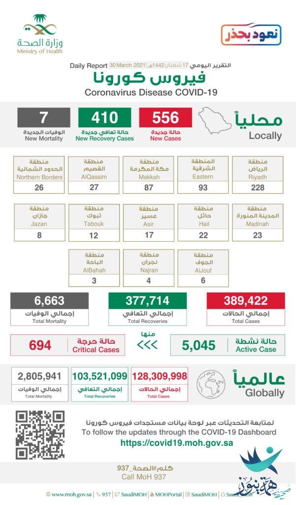 أعلنت وزارة الصحة عن تسجيل 556 إصابة جديدة بفيروس كورونا في السعودية وتسجيل 410حالة شفاء جديدة من فايروس كورونا في السعودية ، والرياض تواصل تصدر مناطق المملكة ب228 إصابة بكورونا ، بينما احتلت المنطقة الشرقية ثاني منطقة في تسجيل أعلى إصابات كورونا اليوم بتسجيلها ٩٣ إصابة ، ثم مكة المكرمة ثالثا ب٨٧ إصابة والقصيم رابعا ب ٢٧ إصابة