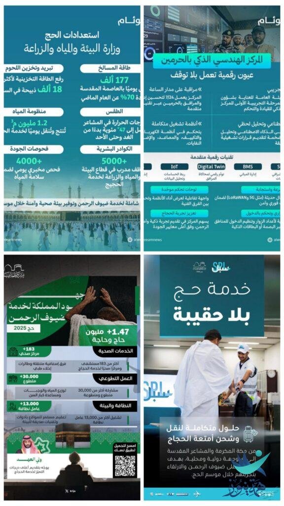 أما على صعيد النقل، فقد شهدت البنية التحتية طفرة كبرى، إذ نُفّذت أكثر من 19 ألف رحلة طيران دولية وداخلية، وشغلت آلاف الحافلات الحديثة لنقل الحجاج بين الحرم والمشاعر وفق جدول دقيق ومحكوم بأنظمة تتبع ذكية. كما وفرت المملكة بيئة لوجستية متكاملة ساعدت في توزيع ملايين الوجبات والعبوات المبردة من المياه، ووصول الخدمات إلى كل حاج أينما كان.