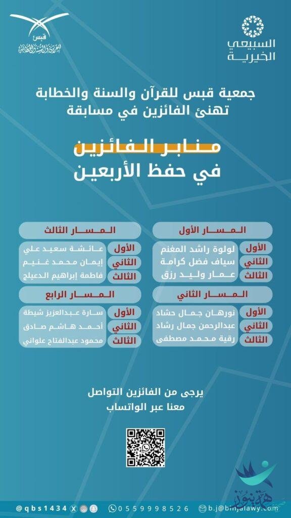 بدعم من مؤسسة عبدالله السبيعي الخيرية، اختتمت جمعية قبس للقرآن والسنة والخطابة النسخة الثانية من مسابقة منازل الفائزين في حفظ الأربعين النووية، والتي نُظّمت عن بُعد واستمرت لأسبوع، وسط تفاعل واسع من مختلف مناطق المملكة وخارجها، حيث بلغ عدد المشاركين أكثر من 500 متسابق ومتسابقة.