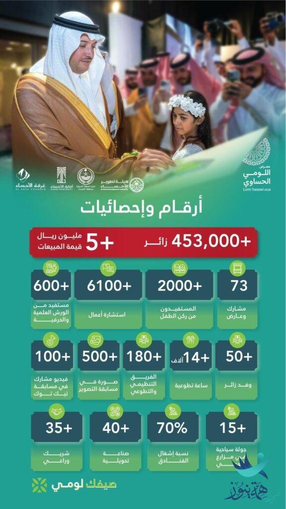 تحت شعار “اللومي الحساوي”، يبرز مهرجان “صيفك لومي” كأحد أبرز الفعاليات التي جمعت بين الأصالة والحداثة، مقدماً تجربة فريدة لزواره لا تقتصر أهمية هذا المهرجان على كونه تجمعاً ثقافياً واقتصادياً، بل تتجسد في الأرقام والإحصائيات التي تعكس حجم الإقبال والنجاح الباهر الذي حققه.