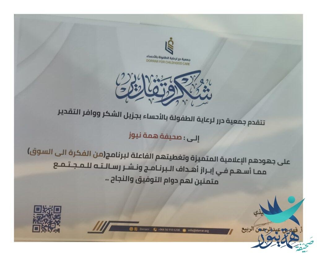 (العيد) مشرف التحرير في صحيفة همة نيوز يستلم شهادة تكريم جمعية درر لرعاية الطفولة بالأحساء للصحيفة…