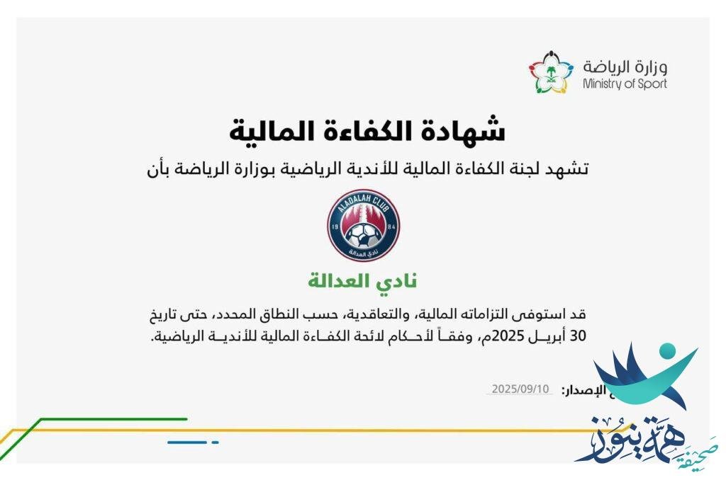 أعلن نادي العدالة من الأحساء ، حصوله على شهادة الكفاءة المالية، مما يتيح له الفرصة لتسجيل لاعبين جدد في الفريق الأول لكرة القدم خلال فترة الانتقالات الصيفية الجارية.