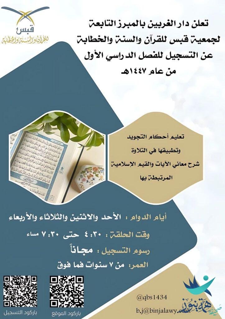 أعلنت جمعية قبس للقرآن والسنة والخطابة عن فتح باب التسجيل المجاني للراغبات في الالتحاق ببرامجها التعليمية والشرعية في دار حمد بن موسى الغربين بمدينة المبرز بمحافظة الأحساء وذلك للفصل الدراسي الأول من عام 1447هـ.