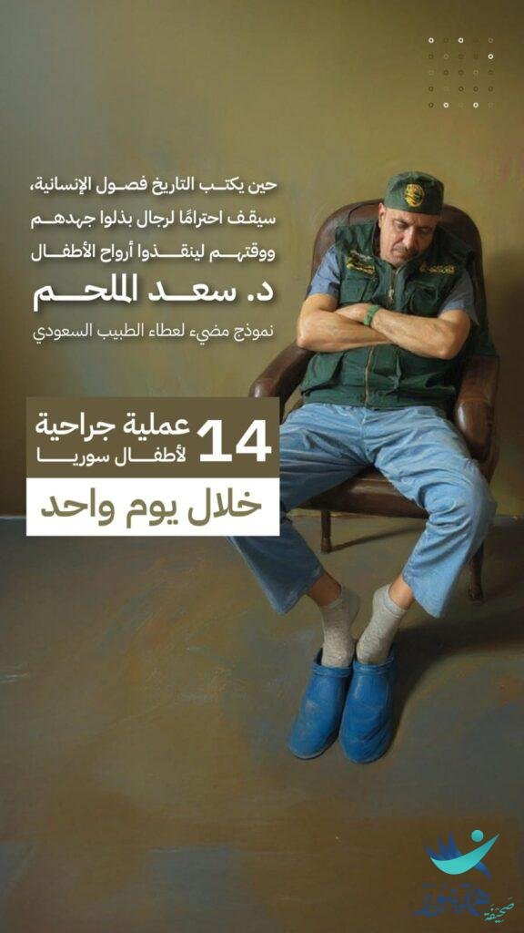 في إنجاز طبي وإنساني يضاف إلى سجل الأطباء السعوديين الحافل، قام الدكتور سعد الملحم، أحد أبناء الأحساء المبدعين، بإجراء 14 عملية جراحية ناجحة لأطفال سوريين في يوم واحد، وذلك ضمن جهود إغاثية تهدف إلى التخفيف من معاناتهم.